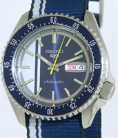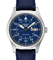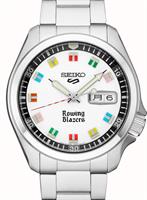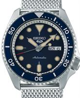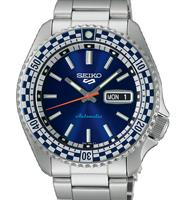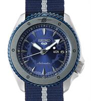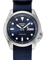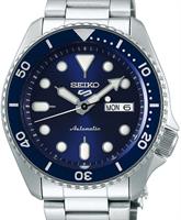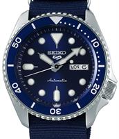 Seiko 5 SBSA091 sports wrist watch. Limited edition of 6,500 pieces. 100m water resistant, powered by SEIKO 24 jewels 4R36 Japanese Automatic movement with Day/Date calendar. Stainless steel case with uni-directional rotating grey insert 0-60 bezel and blue nylon strap with white stripe. Blue color dial with Lumibrite hands and markers.