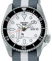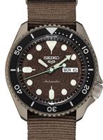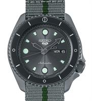 Seiko 5 SBSA097 sports wrist watch. Limited edition of 6,500 pieces. 100m water resistant, powered by SEIKO 24 jewels 4R36 Japanese Automatic movement with Day/Date calendar. Stainless steel case with uni-directional rotating 0-60 bezel and grey nylon strap with green stripe. Grey color dial with Lumibrite hands and markers.