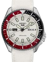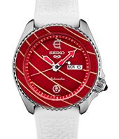 Seiko 5 SBSA105 sports wrist watch. Limited edition of 700 pieces. 100m water resistant, powered by SEIKO 24 jewels 4R36 Japanese Automatic movement with Day/Date calendar. Stainless steel case with red uni-directional rotating bezel and white silicone strap. Red color dial.