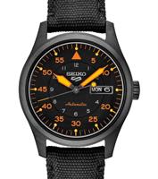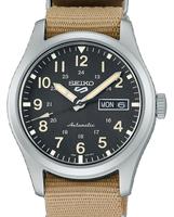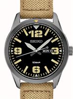 Seiko watch model SUR493 from Seiko Essentials Collection. Black plated stainless steel case with beige nylon, black color dial with luminous hands and markers. 100 meters water resistant