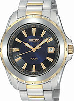 Seiko SGEE72 wrist watch from Seiko Men`s Sport Watches Collection. 100m Water Resistant. SEIKO Japanese Quartz movement with Date calendar. Stainless steel case with gold plated accents. Blue color dial. Stainless steel watch bracelet with gold plated accents