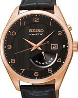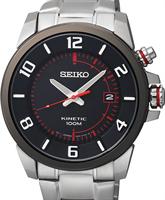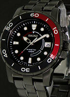 Seiko Kinetic watch model SKA389 with power reserve indicator. Water resistant to 100 meters. Black stainless steel case and watch bracelet, black and red uni-directional 0-60 bezel, black color dial with large luminous markers, screw- down see-through case back