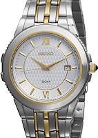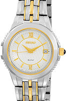 Seiko SGEE94 wrist watch from Seiko Men`s Sport Watches Collection. 50m Water Resistant. SEIKO Japanese Quartz movement with Date calendar. Stainless steel case with gold plated accents. Silver color dial with gold tone markers. Stainless steel watch bracelet with gold plated accents