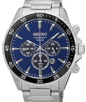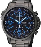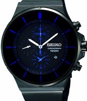 Seiko chronograph watch model SNDD59 from Seiko Sport Collection. Stainless steel black plated case and watch bracelet, blue dial