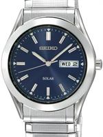Seiko Solar powered wrist watch model SNE361. 100m Water Resistant. SEIKO Japanese Quartz movement with Day/date calendar. Stainless steel case and bracelet. Blue color dial.