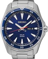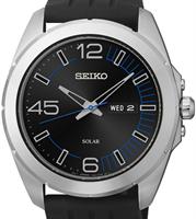 Seiko Solar powered wrist watch model SNE277. 100m Water Resistant. SEIKO Japanese Quartz movement with Day/date calendar. Stainless steel case with rubber band. Black dial with blue color accents.