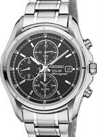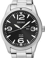 Seiko Solar powered wrist watch model SNE211. 100m Water Resistant. SEIKO Japanese Quartz movement with Day calendar. Stainless steel case with black bezel. Black color dial. Stainless steel bracelet