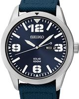 Seiko Solar powered wrist watch model SNE329. 100m Water Resistant. SEIKO Japanese Quartz movement with Day/date calendar. Stainless steel case. Blue color dial. Blue nylon strap.
