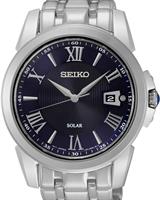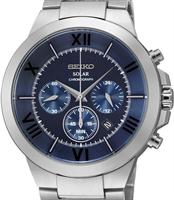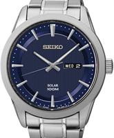 Seiko Solar powered wrist watch model SNE395. 100m Water Resistant. SEIKO Japanese Quartz movement with date calendar. Stainless steel case and bracelet. Sapphire crystal. Blue color dial.