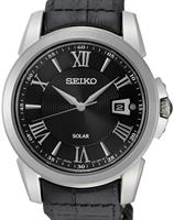 Seiko Solar powered wrist watch model SNE397. 100m Water Resistant. SEIKO Japanese Quartz movement with date calendar. Stainless steel case with leather band. Sapphire crystal. Black color dial.