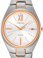 Seiko Solar powered wrist watch model SNE878. SEIKO Japanese Quartz movement with date calendar. Stainless steel case and bracelet with rose gold plated accents. White dial.