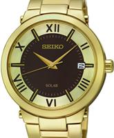 Seiko Solar powered wrist watch model SNE884. 100m Water Resistant. SEIKO Japanese Quartz movement with date calendar. Stainless steel yellow gold plated case and bracelet. Champagne/brown dial with Roman numerals.