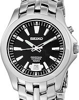 Seiko Perpetual Calendar watch model SNQ101. Steel case. Black color dial with date. Steel bracelet. 100 meters water resistant.