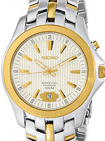Seiko Perpetual Calendar watch model SNQ102. Steel case and bracelet with gold tone accents. White color dial with date. 100 meters water resistant.