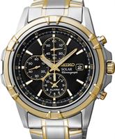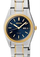 Seiko Solar powered wrist watch model SUT110. SEIKO Japanese Quartz movement with Day/Day calendar. Gold plated accents on stainless steel case and bracelet. Blue dial.