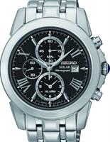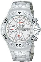 Seiko SNA271 Alarm Chronograph wrist watch. 100m Water Resistant. SEIKO Japanese Quartz movement with Date calendar. Stainless steel case with uni-directional rotating 0-60 bezel. White color dial with luminous markers and hands. Stainless steel watch bracelet.