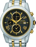 Seiko Solar powered wrist watch model SNE412. 100m Water Resistant. SEIKO Japanese Quartz movement with date calendar. Stainless steel case and bracelet with gold ton accents. Black textured dial.