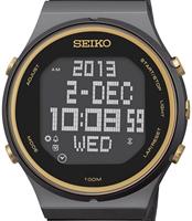 Seiko wrist watch model STP011. SEIKO Japanese digital Quartz movement. Black plated stainless steel case with gold tone accents. Black digital dial. Stainless steel bracelet
