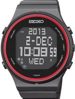 Seiko SKA553 wrist watch from Seiko Men`s Sport Watches Collection. 100m Water Resistant. SEIKO Japanese Quartz movement with Date calendar. Stainless steel case with bracelet. Black color dial with red accents.