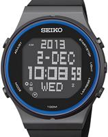 Seiko wrist watch model STP015. SEIKO Japanese digital Quartz movement. Black plated stainless steel case with blue accents. Black digital dial. Stainless steel bracelet