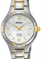 Seiko ladies watch model SUP292. Solar powered movement. Titanium case and watch bracelet with gold plated accents, white Mother-of-Pearl dial. 30 water resistant.