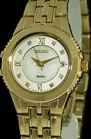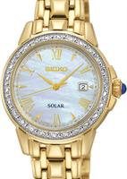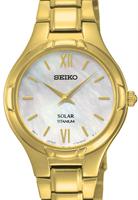 Seiko ladies watch model SUP294. Solar powered movement. Gold plated titanium case and watch bracelet, white Mother-of-Pearl dial. 30 water resistant.