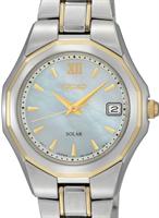 Seiko ladies watch model SUT058. Solar powered movement. Stainless steel case and watch bracelet with gold tone accents, Mother-of-Perl dial.