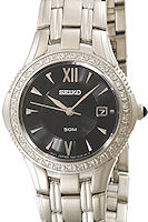 Seiko quartz solar powered dress watch model SUT067. Stainless steel case with bracelet and diamonds on the bezel. Black color dial