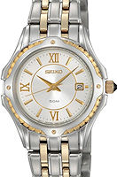 Seiko watch model SKK728. Stainless steel case and bracelet with gold plated accents. Diamonds on the bezel. White dial with date. Sapphire crystal. Water resistant to 100 meters