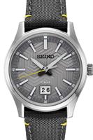Seiko watch model SUR543 from Seiko Essentials Collection. Stainless steel 40mm case with grey nylon/leather strap, grey color dial with luminous hands and big date calendar. 100 meters water resistant