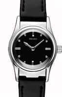 Seiko Braille for visually impaired watch model SWL001 from Seiko Essentials Collection. Stainless steel case with black leather band. Black color dial with hinged acrylic crystal which opens to allow access to raised markers.