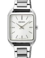 Seiko watch model SWR073 from Seiko Essentials Collection. Stainless steel rounded rectangular case, white textured dial. Bracelet. 50 meters water resistant