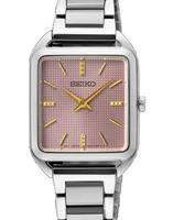 Seiko watch model SWR077 from Seiko Essentials Collection. Stainless steel rounded rectangular case, rose textured dial. Bracelet. 50 meters water resistant