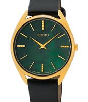 Seiko watch model SWR080 from Seiko Essentials Collection. Gold plated stainless steel case, green Mother-of-Pearl dial. Black leather strap. 50 meters water resistant