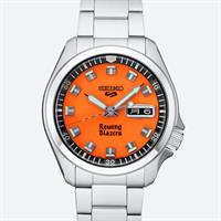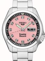 Seiko 5 SBSA087 sports wrist watch. Naruto Boruto Limited edition of 6,500 pieces. 100m water resistant, powered by SEIKO 24 jewels 4R36 Japanese Automatic movement with Day/Date calendar. Stainless steel case with uni-directional rotating steel insert. Black NATO style nylon strap with pink center stripe. Grey textured dial with Lumibrite filled hands and markers.