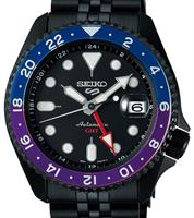 Seiko 5 Yuto Horigome Limited Edition model SSK027. Limited to 2,700 pieces Worldwide, this collaboration honors the first ever Olympic skateboarding gold medalist, Yuto Horigome of Japan. Japanese made Seiko 4R34 automatic movement with date and GMT function. Black plated stainless steel case and bracelet. Black dial with LumiBrite filled hands and markers. Hardlex mineral glass crystal with bubble date magnifier. Smooth rotating duo-directional bezel with blue and purple 24 hour insert. Water resistant to 100 meters.