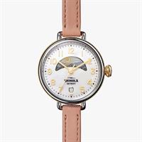 Shinola Detroit Birdy Collection Model S0120306832 powered by quartz movement. Petoskey stone dial with Arabic numerals. Comes in stainless steel case with bracelet and gold PVD plated accents.