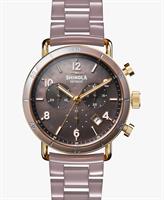 Shinola Detroit Canfield Collection Model S0120230478 powered by quarts chronograph movement. White Mother-of-Pearl dial with golden Arabic numerals and indexes. Ceramic 0-60 bezel. Comes in stainless steel gold plated case on blush ceramic bracelet.
