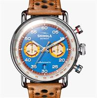 Shinola Detroit Canfield Speedway Lap 05 limited edition of 500 pieces. Sellita SW510 automatic chronograph movement. White Alabaster dial with blue sub-dials. Solid stainless steel case. Brown leather strap. Sapphire crystal.