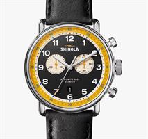 Shinola Detroit Canfield collection model S0120291082. Powered by a Swiss made quartz chronograph movement. The black dial with white sub-dials and yellow outer ring. Sapphire crystal. High polished stainless steel case. Black leather strap with tang style buckle.