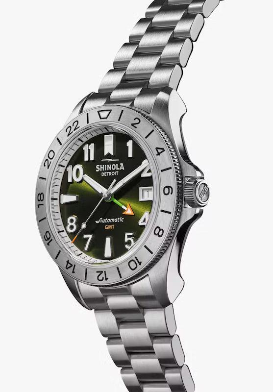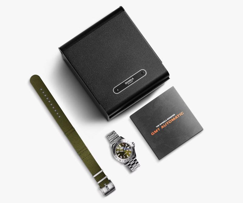 Shinola Monster GMT, factory model S0101000086. Swiss made Sellita SW330 automatic movement with date and GMT functions. Solid stainless steel case and bracelet. Olive green dial with luminous Arabic markers and hands. Stainless steel duo-directional 24 hour bezel. Raised sapphire crystal. Water resistant to 100 meters. Comes in a set with an additional strap.