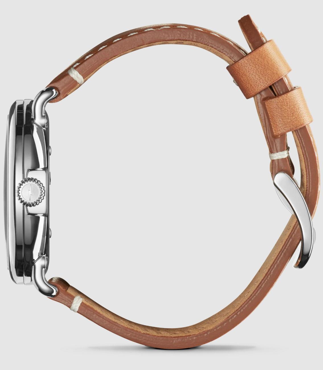 Green dial with white Arabic numerals and small seconds sub-dial. Comes in stainless steel case on tan leather band.