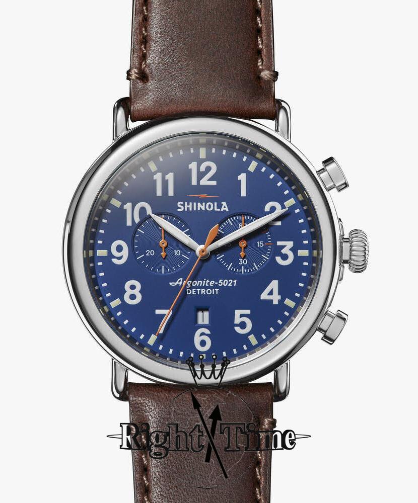 Shinola Detroit Runwell Collection Model S0110000117 powered by quarts chronograph movement. Blue dial with white Arabic numerals and date calendar. Comes in stainless steel case on brown leather band.