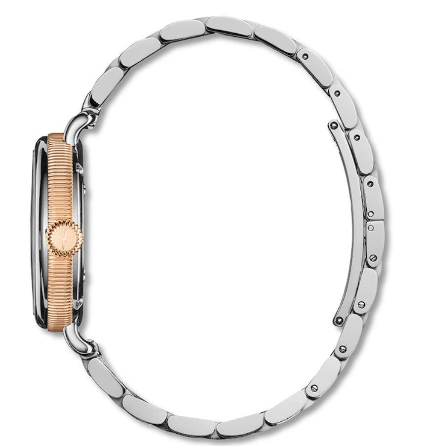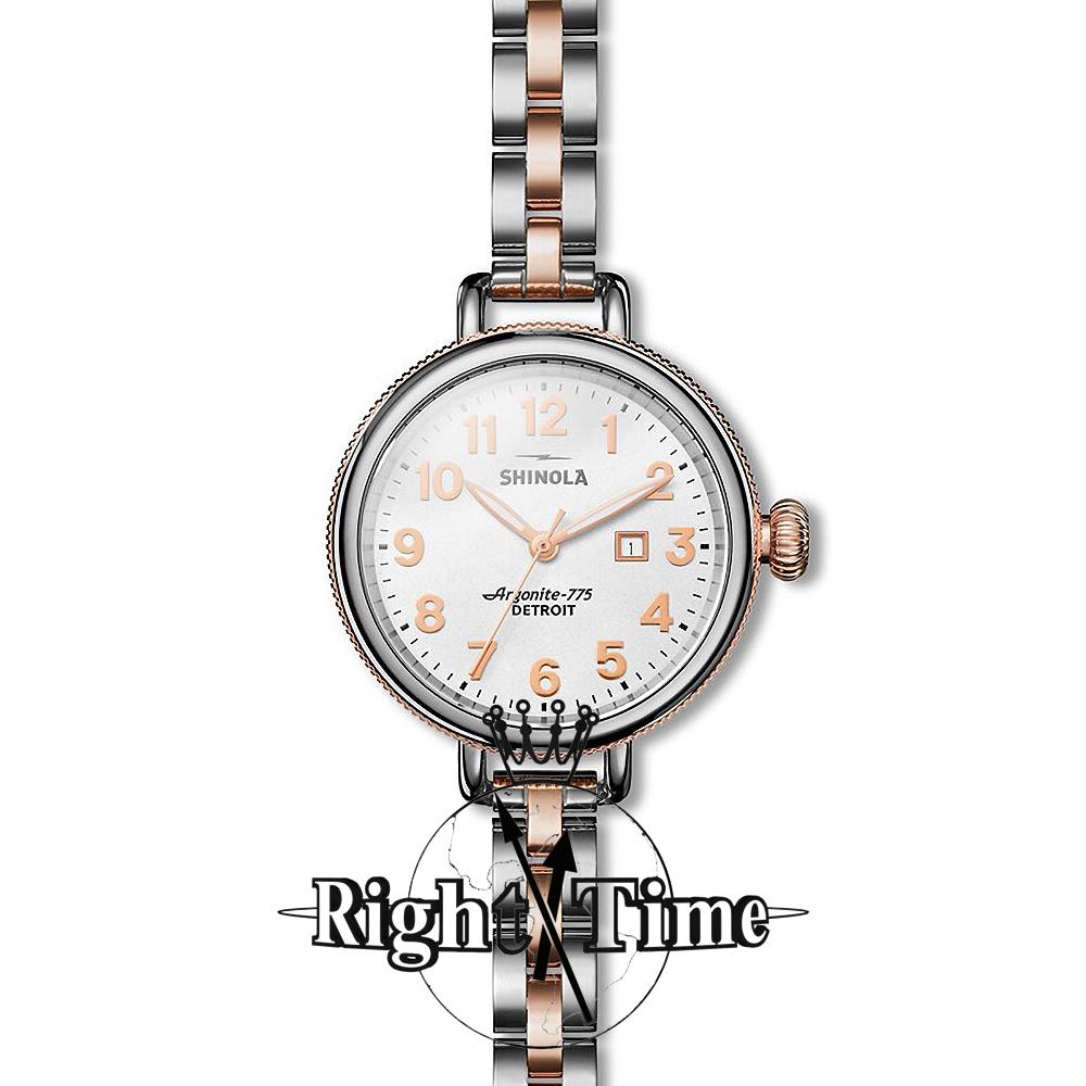 Shinola Detroit Birdy Collection Model S0120001100 powered by quarts movement. White Mother-of-Pearl dial with rose gold tone Arabic numerals and date calendar. Comes in 2-tone stainless steel case with bracelet.