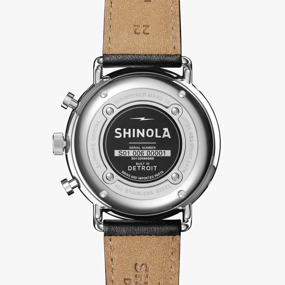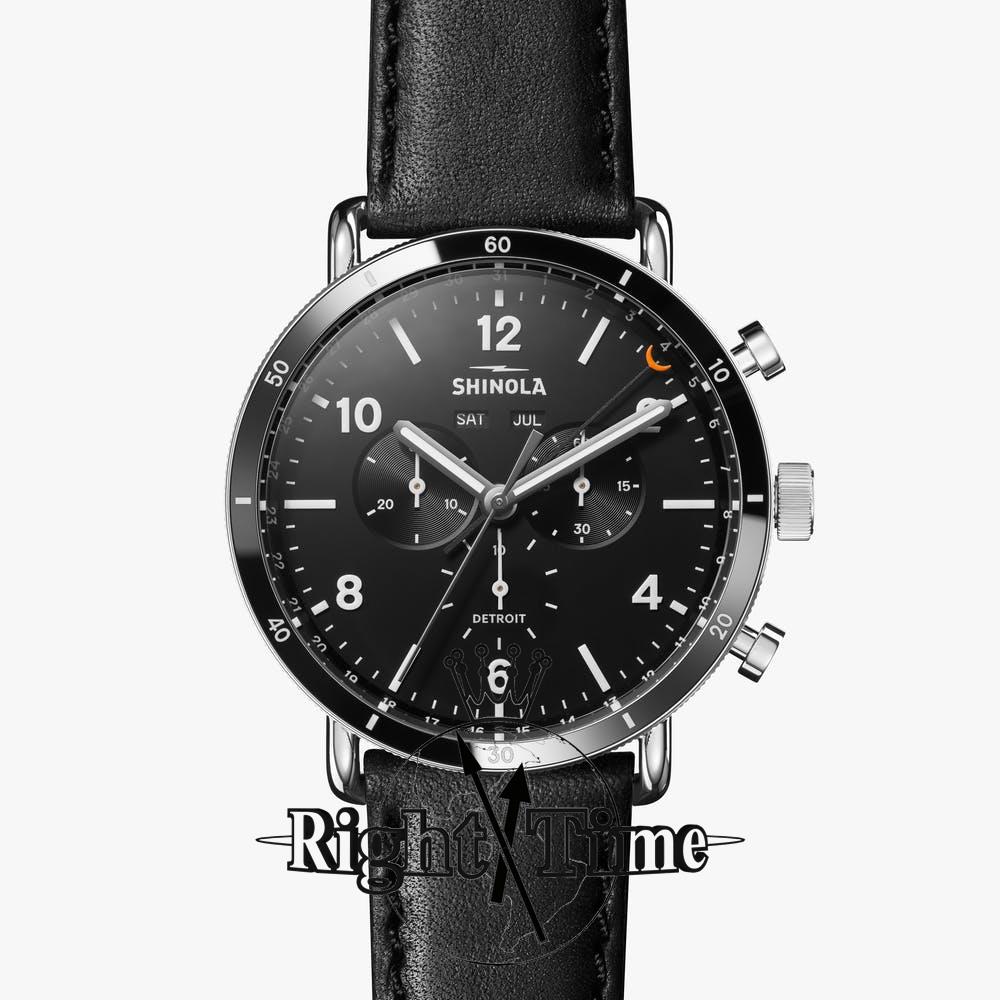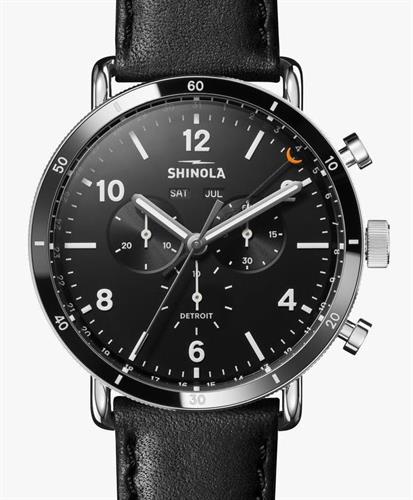 Shinola Detroit Canfield Collection Model S0120089889 powered by quarts chronograph movement. Black dial with white Arabic numerals and indexes. Comes in stainless steel case on black leather band.