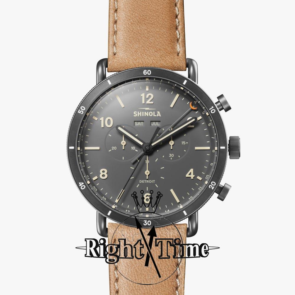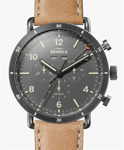 Shinola Detroit Canfield Collection Model S0120089891 powered by quarts chronograph movement. Gray dial with white Arabic numerals and indexes. Comes in gray PVD plated stainless steel case on brown leather band.