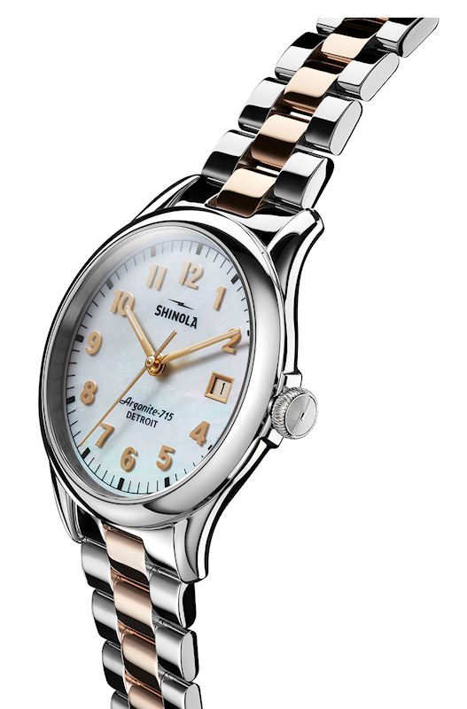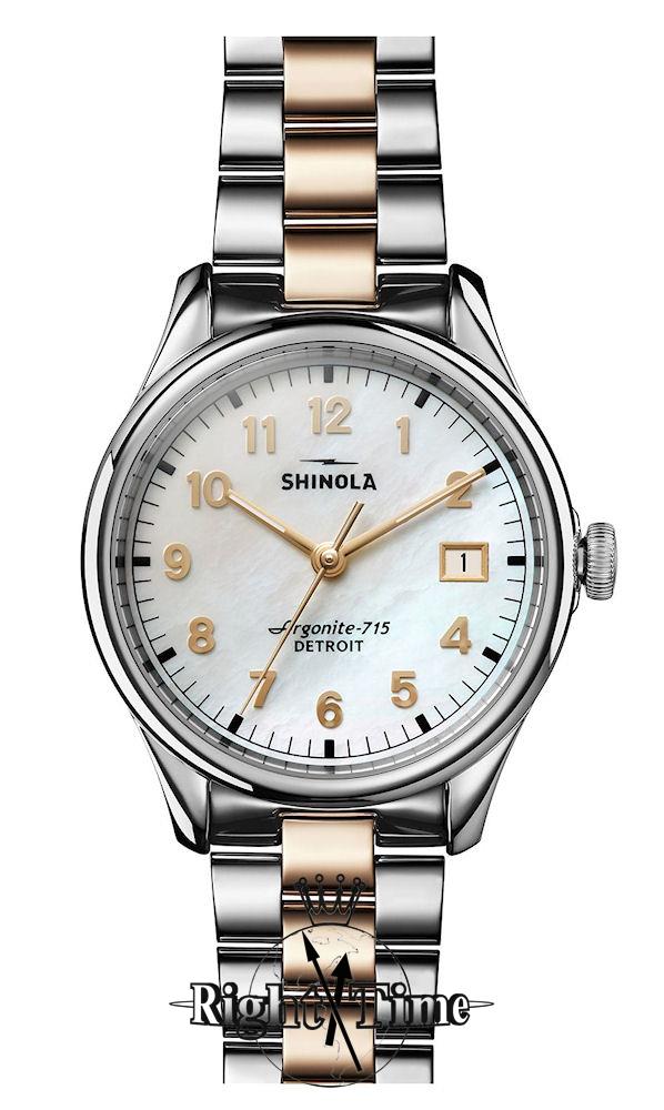 Shinola Detroit Vinton Collection Model S0120155180 powered by quartz movement. White Mother-of-Pearl dial with Arabic numerals and date calendar. Comes in 2-tone stainless steel case with bracelet.