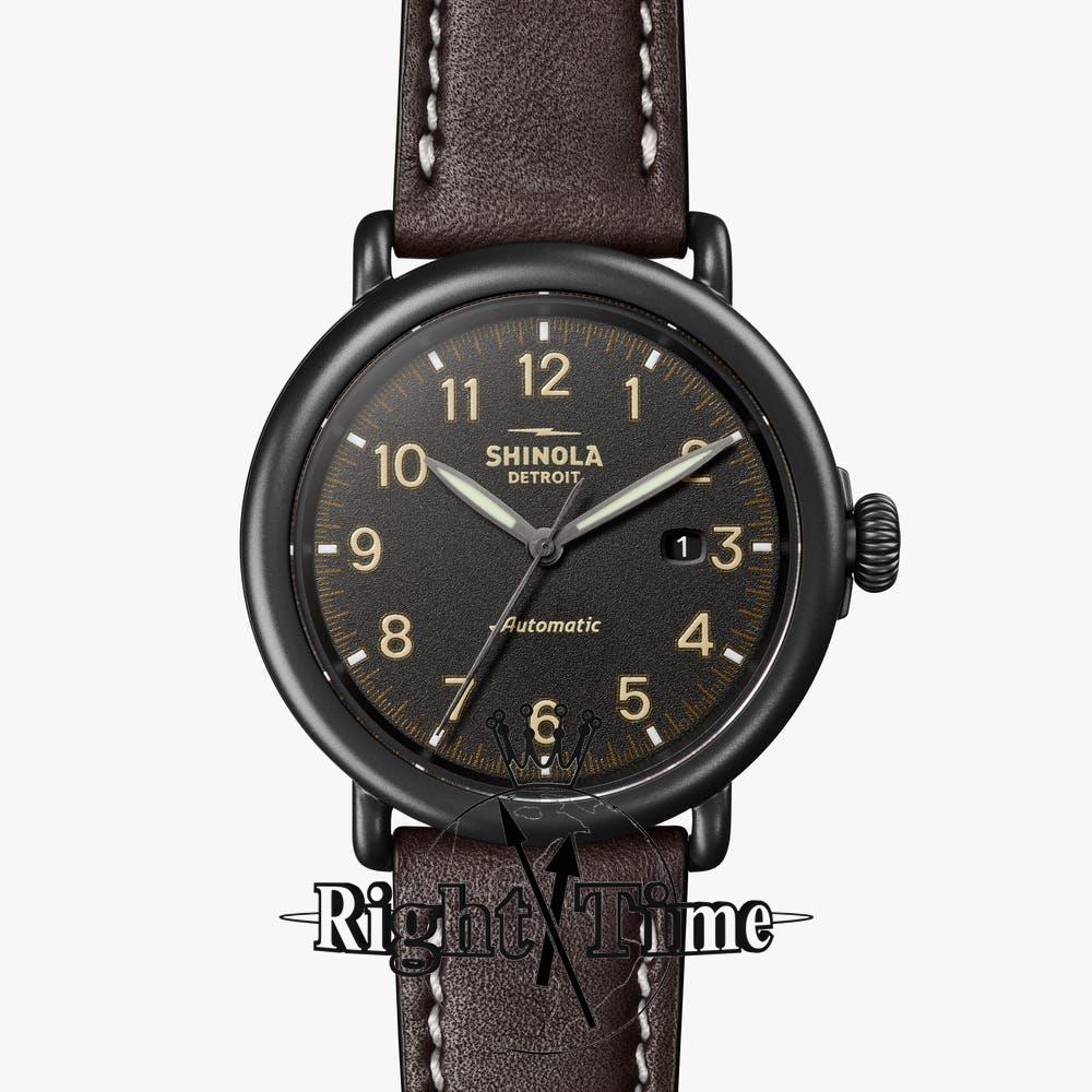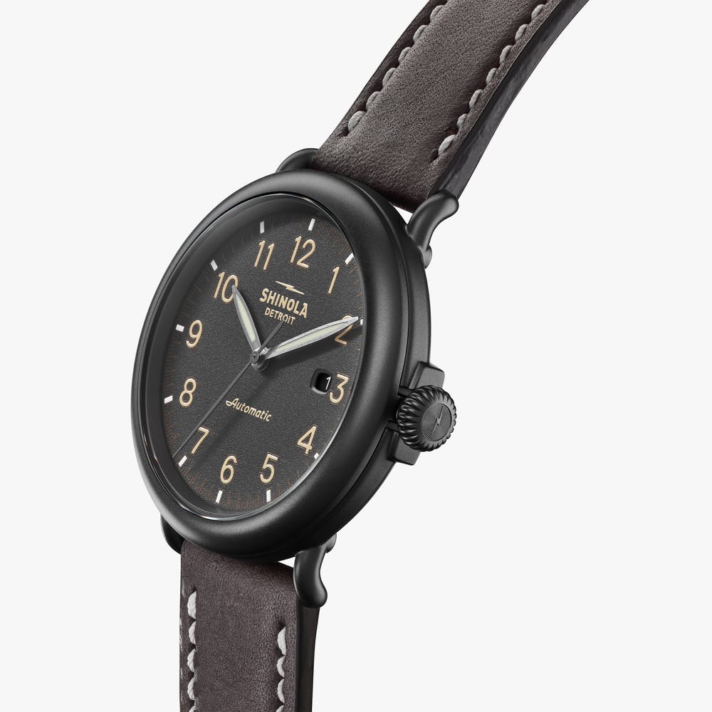Shinola Detroit Runwell Collection Model S0120161940 powered by automatic movement. Matte black vellum-textured dial with Arabic numerals and date calendar. Comes in black PVD plated stainless steel case on brown leather strap.
