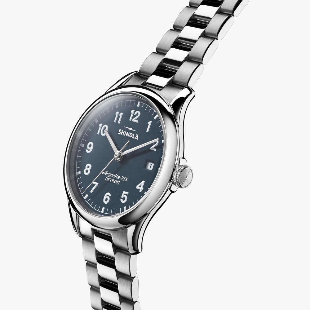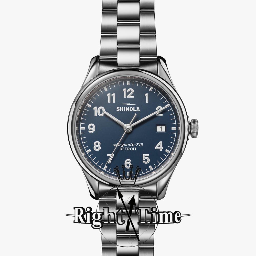 Shinola Detroit Vinton Collection Model S0120161945 powered by quartz movement. Midnight blue dial with Arabic numerals and date calendar. Comes in stainless steel case with bracelet.