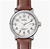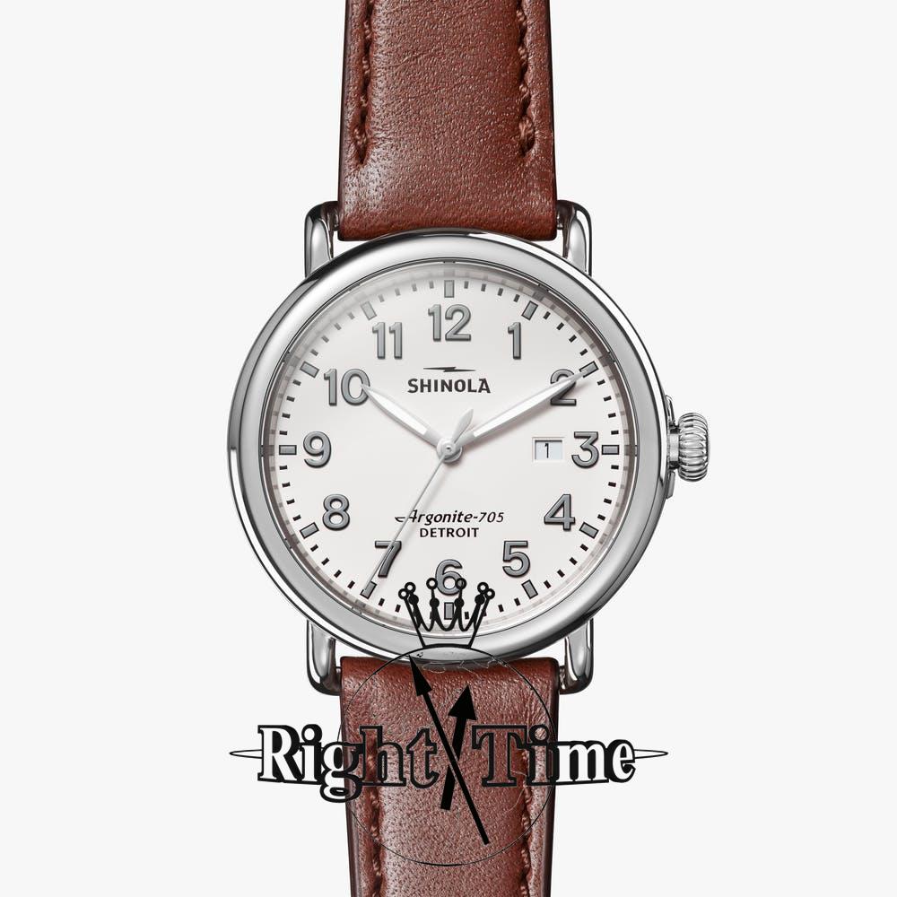 Shinola Detroit Runwell Collection Model S0120172979 powered by quarts movement. White alabaster dial with steel color Arabic numerals and date calendar. Comes in stainless steel case on brown leather band.